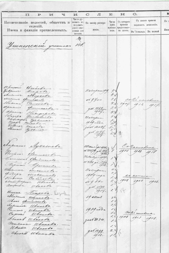Переселенческая льгота им предоставлена с начала 1908 года, денежные средства подлежат зачислению 1913 – в ½ оклада, в полный оклад – 1918.