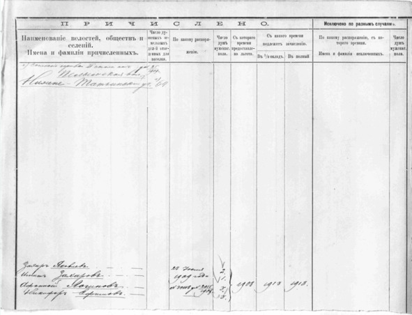 Согласно Справки П стола, дело №25/1909 года на Нижне -Татьинский участок 23 июля 1909 года зачислен Афанасий Логинов, №30118, дело 2015/1908 – 3 души.