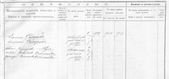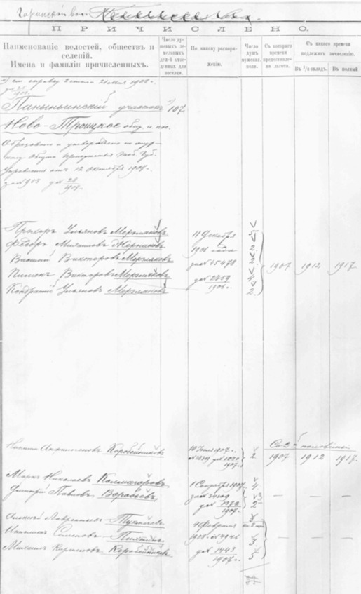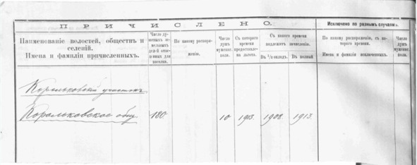 Причислены к Корольковскому участку Андрей Васильев Олемпьев – 4 души, Дмитрий Васильев Олемпьев – 3 души мужского пола от 07.02.1907 за №4719, за №2768/1906.30