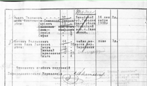 В этом списке значатся жители Витебской губернии, Городокского уезда, Обольской волости, дер. Плюгавкина, которые прибыли в поселок 16.09.1908 года, земли отведено на 1 душу: