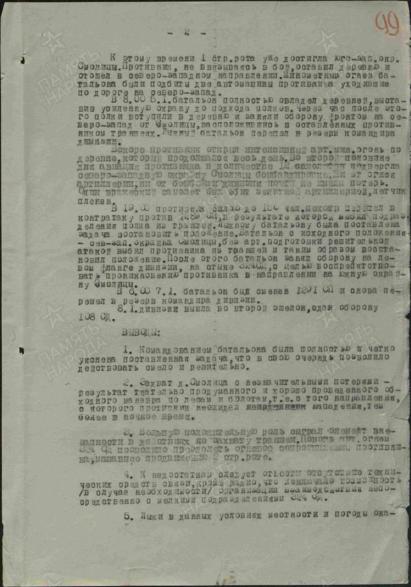 Лыжному батальону была поставлена задача восстановить положение. Батальон с исходного положения сев.-зап. окраина Смолицы без арт. подготовки решительной атакой выбил противника из траншеи и таким образом восстановил положение.