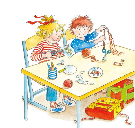Дети рисуют каждый по зебре, вырезают их и приклеивают на картонные кружки с двумя дырочками у края. Конни с Юлией плетут разноцветные шнурки из ниток. Теперь картонку можно будет повесить на шею. На случай, если кто-то вдруг отстанет от группы, на обратной стороне картонки записаны телефоны и имена родителей каждого ученика. Конни очень ждёт эту поездку: наконец-то она вживую увидит всех зверей!