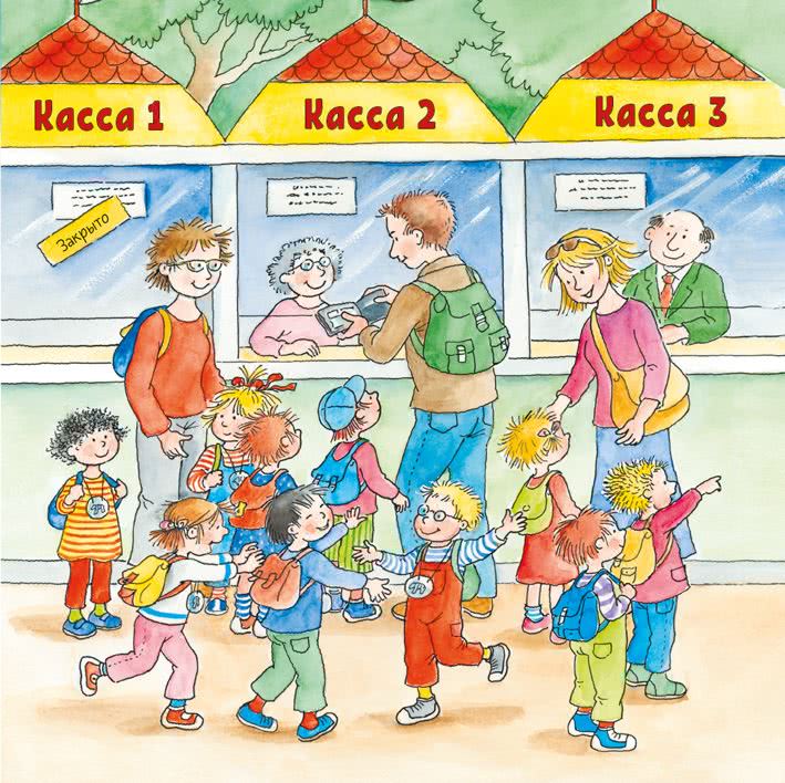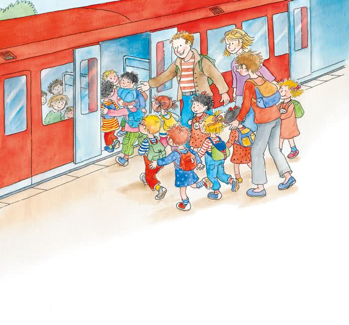 Когда электричка останавливается у платформы, дети шумной толпой заходят в вагон. Ехать им совсем недалеко – вскоре уже видны высокие дома большого города. На Центральном вокзале класс сходит с электрички и пересаживается на метро. И вот наконец они у кассы зоопарка. Господин Вебер покупает на всех билеты.