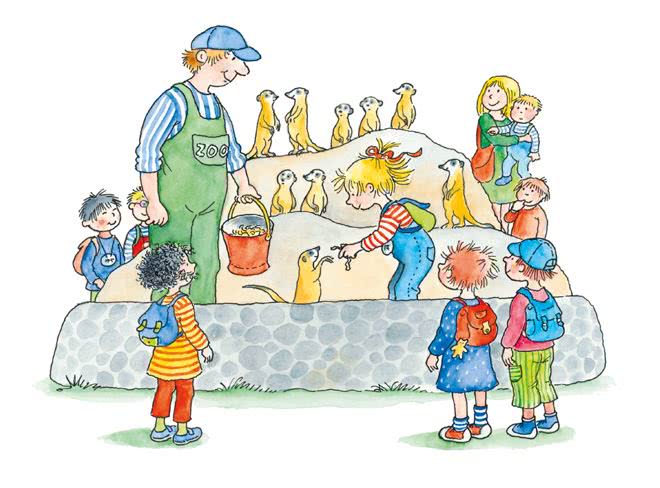 У входа их уже ждёт господин Лоренц – смотритель зоопарка. Он проведёт экскурсию. Первым делом дети идут к сурикатам. Их как раз собираются кормить. Настоящими червяками!