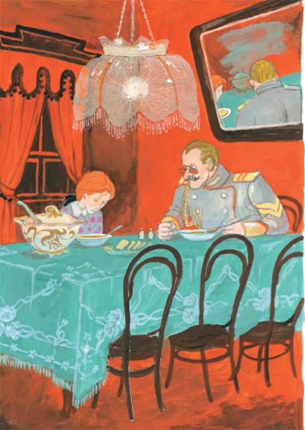 На другой день за обедом Ева встретилась с папой. Ева на месте хозяйки разливает суп. Ева волнуется, двумя руками поднимает тарелку с супом для папы.