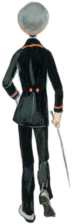 Потом стряхнул пыль со своей серой блузы и отошел. Надел фуражку, поднял хлыстик, брошенный на землю, и повернул в аллею. Плечи откинул, спина прямая. Удаляется, помахивая хлыстиком.