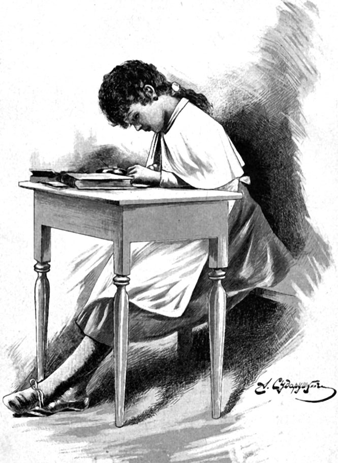 Классная дама взяла меня за руку и отвела на одну из ближайших скамеек. На соседнем со мною месте сидела бледная, худенькая девочка с двумя длинными, блестящими, черными косами.