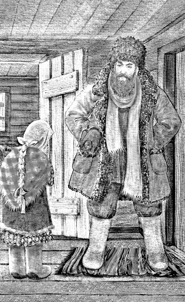 Быстро открыв лицо, Сибирочка увидела стоявшего над ней какого-то высокого, в меховом кафтане человека. Этот-то кафтан и высокая мохнатая шапка делали его очень похожим на лесного зверя, и немудрено, что испуганная насмерть Сибирочка приняла его за медведя. К нему подошли ещё трое таких же мохнатых, благодаря их тёплым, мехом наружу, одеждам, людей. Эти были поменьше ростом, но показались Сибирочке не менее страшными, нежели первый, при слабом лунном сиянии. Все четверо склонились над девочкой, почти потерявшей сознание в этот миг.