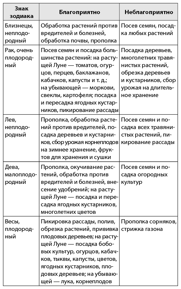 Близнецы, Лев и Водолей, наоборот, самые неплодородные знаки, поэтому, когда Луна находится в них, не стоит проводить работы по борьбе с сорняками и вредителями, обрабатывать почву и обрезать растения.