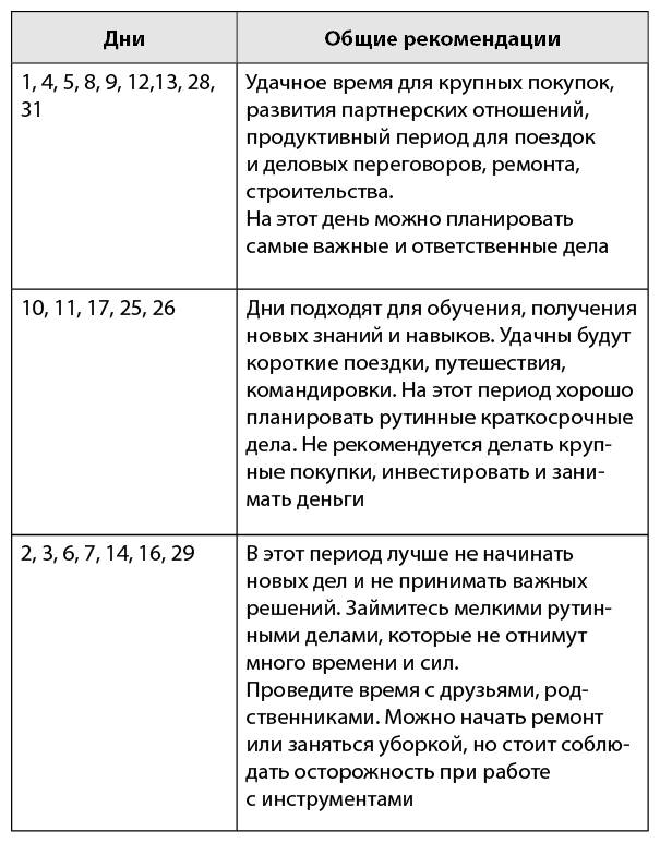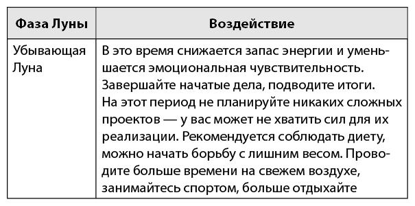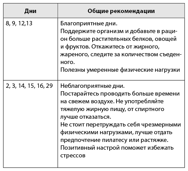 Кроме этого, в календаре содержится информация по поддержанию здоровья и хорошего самочувствия, даны советы по выбору физической нагрузки, рекомендации по питанию, народные приметы, связанные с Луной.