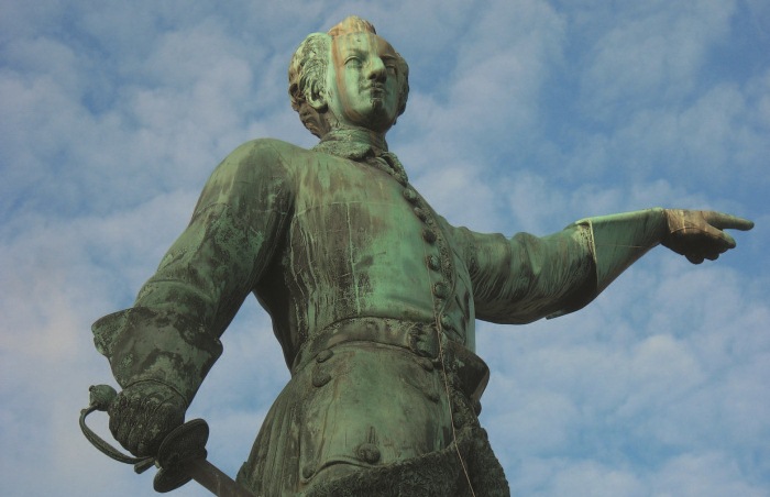 Шведский король Карл XII указывает на восток. Памятник в Стокгольме
