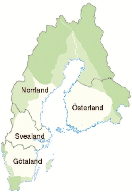 Карта исторических земель Швеции: Гёталанд, Свеаланд, Норрланд и шведская провинция Эстерланд в Финляндии