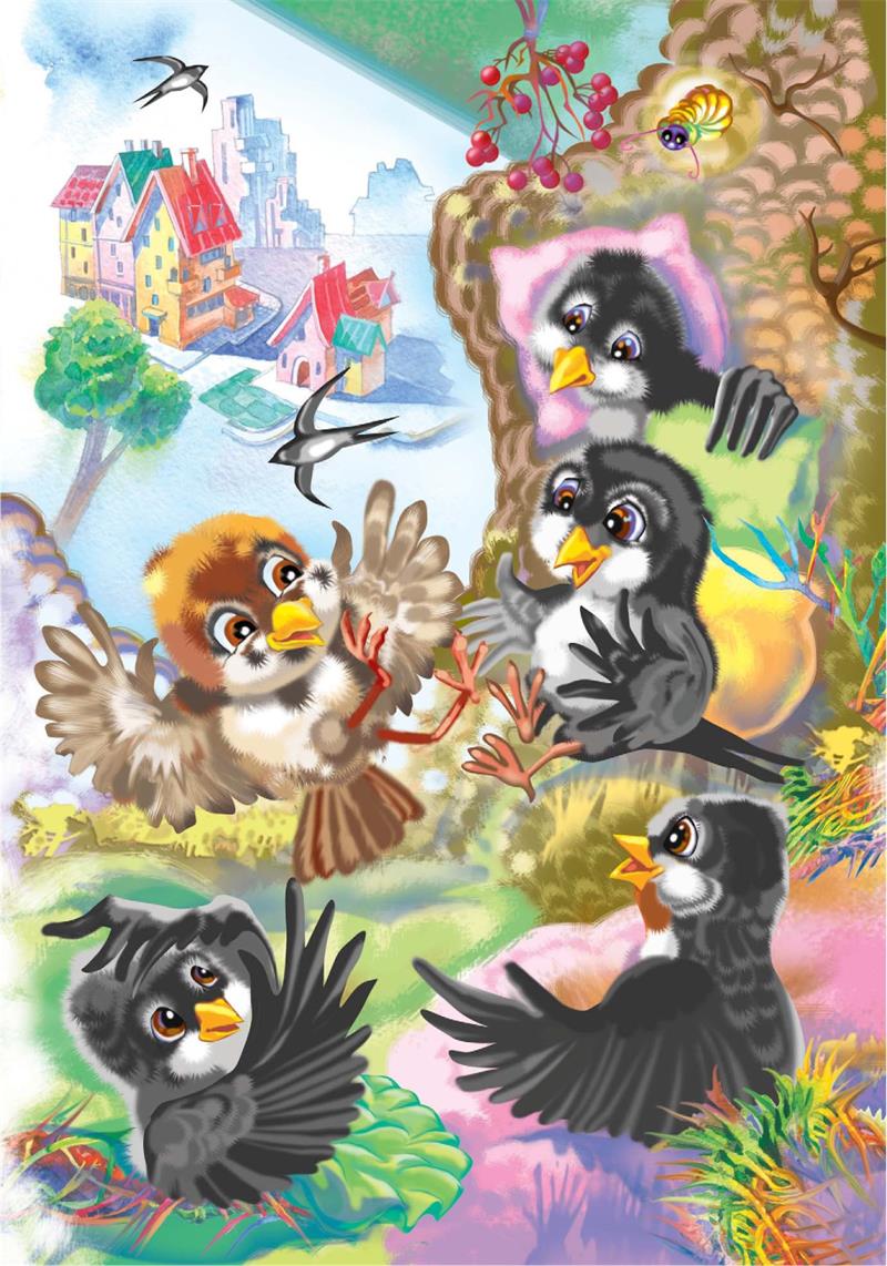 Шли дни. Росли ласточкины детки, и с ними рос смелый воробушек. И только когда птенцам пришло время вылетать из гнезда, родители обнаружили, что Чубчик не ласточка. Странно, конечно, что они этого сразу не заметили, но на самом деле ничего странного в этом не было. Каждый день на родителей наваливалось столько забот, что у них головы шли кругом.