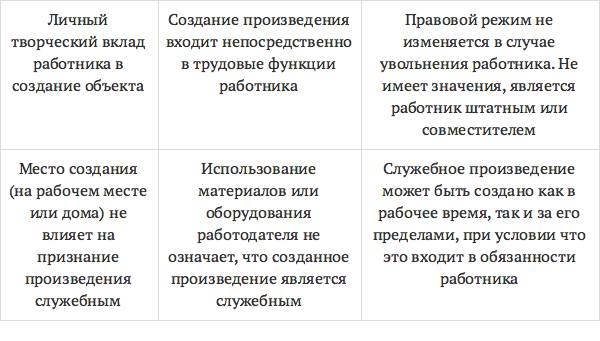 В большинстве случаев в юридической литературе при перечислении признаков служебных произведений, обычно применяемых исследователями, наиболее общими критериями являются следующие из них.