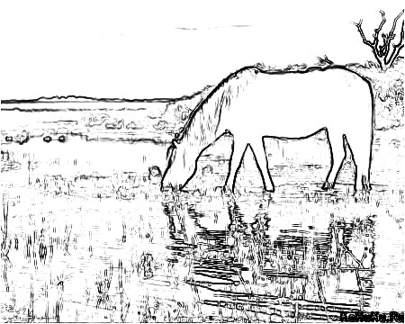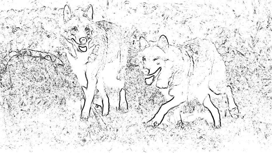 Пролетев еще немного, орёл увидел большое желтовато-серое облако пыли, поднимающееся над степью. Это табун диких лошадей устремился к реке, ища спасения от жары и жажды. Тяжёлый топот и громкое ржание разнеслись по степи. Рыжие лошади добежали до пологого берега реки, зашли в воду и с жадностью принялись пить прохладную живительную влагу. И снова степь стала, как и прежде, безмолвной. Только иногда фырканье лошадей и негромкие всплески воды нарушали тишину. Орёл продолжал не спеша лететь вдоль извилистой реки. Вдруг он заметил стаю степных волков, медленно приближающихся к реке в надежде насладиться прохладной водой после долгого пути по знойной степи. На серых волчьях шкурах были разбросаны огненно-рыжие пятна, сливающиеся с цветом степи. В высокой траве волки были почти не видны, но лошади их быстро почуяли, испуганно заржали и бросились бежать обратно в степь. Волки не стали их догонять, они подошли к реке и начали жадно пить воду.