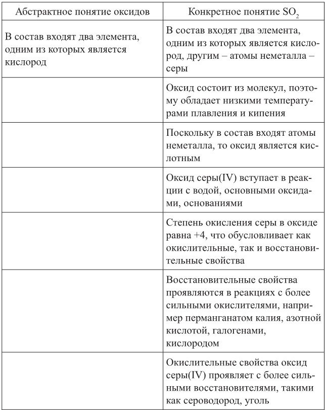 Так, знание только состава оксида серы SO2 ещё не отражает понимания реального оксида. Его реальное существование отразит конкретное понятие. Сопоставим абстрактное и конкретное содержание этого понятия.