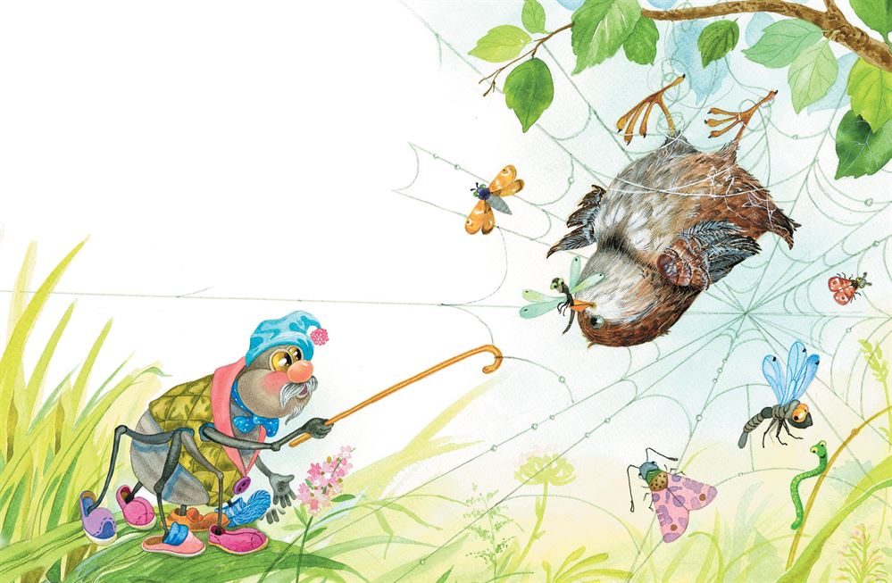 – Значит, не окрепли ещё! – пробормотал птенец, качаясь в паутине вниз головой.