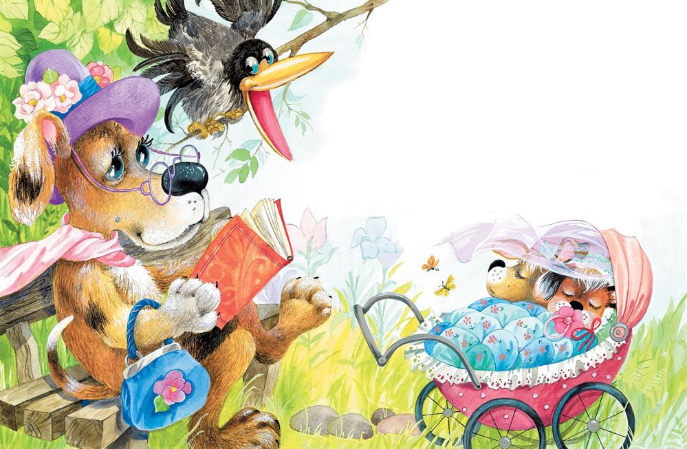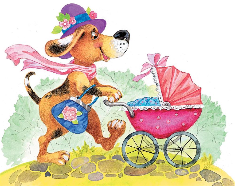 Однажды мама-собака вышла на прогулку со своими маленькими щенятами. Щенки поиграли немножко, а потом заснули в колясочке. Мама-собака села на лавочку, достала книжечку и стала читать. Читает себе, читает, покачивает коляску.