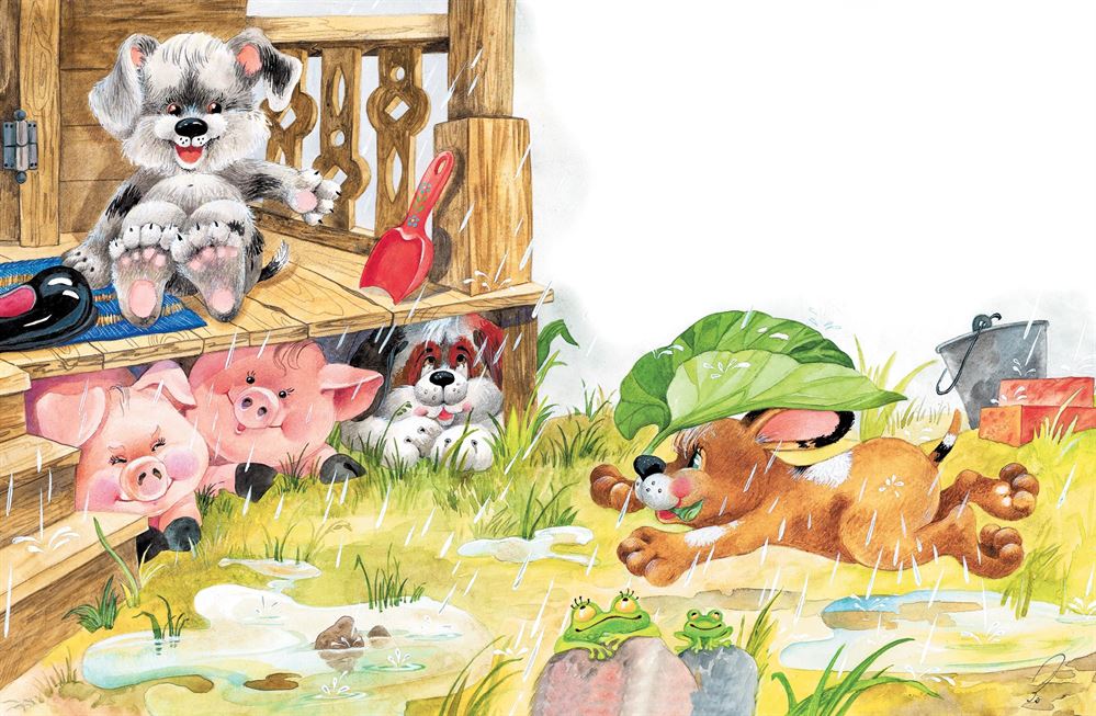Щенки и поросята спрятались под крыльцо, чтобы не промокнуть.