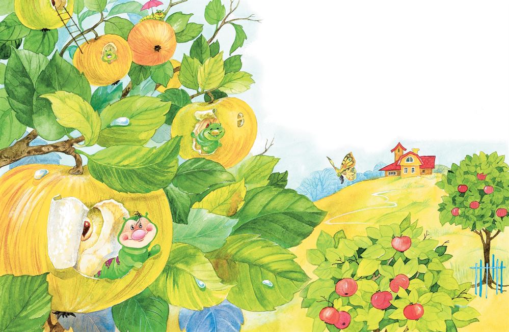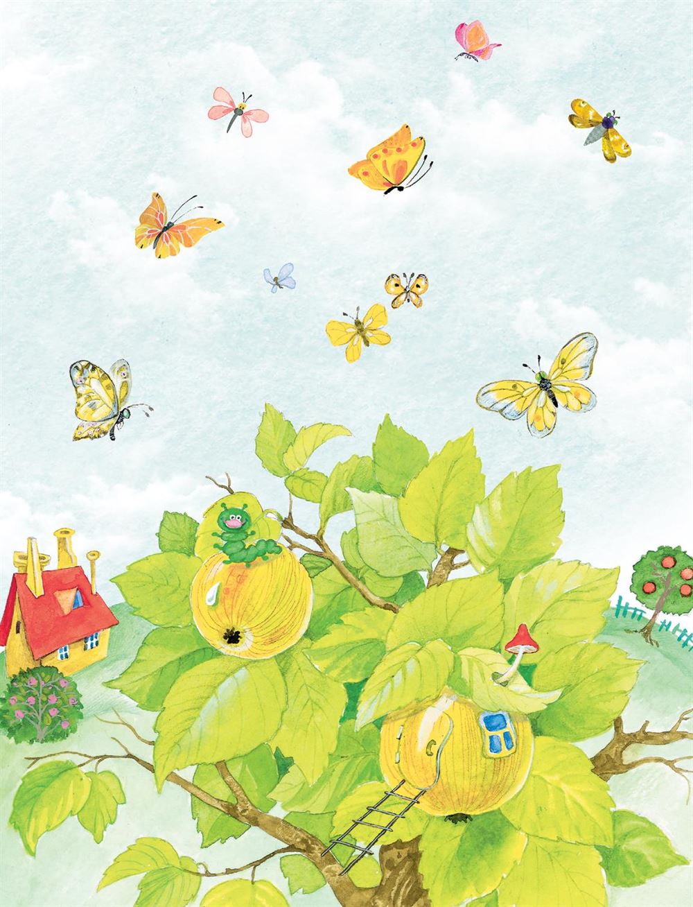 Они ещё недолго полетали, и бабочка спустилась к яблоньке и села на яблоко, в котором жил червячок.
