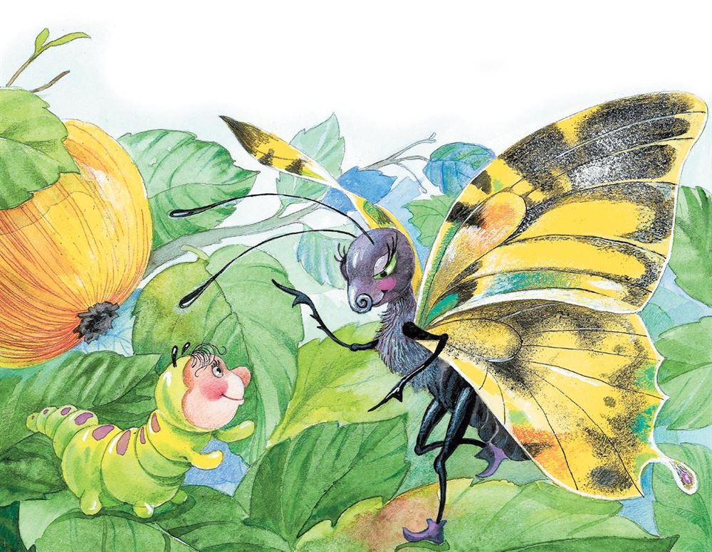 Бабочке стало жалко червячка. Она вспомнила, как сама была раньше гусеницей и мечтала летать.