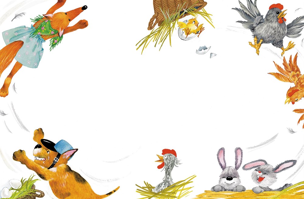 Но в пасти вместо лисьего хвоста очутился пучок перьев. Пёс в недоумении остановился и сплюнул перья, а от него стремительно убегала рыжая курица, орущая на весь курятник: