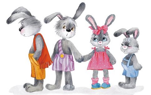 Давайте познакомимся с ними. Стёпка – самый старший, потом Трошка, сестричка Стешка и, наконец, самый младший – Фимка. «Фимуля», – ласково называла его мама-зайчиха. Все они были серенькие, ушастенькие. Глазки у них были чёрненькие, смешливые, а рожицы – задорные. Но в целом они были самыми обыкновенными зайчатами. Только не говорите об этом маме-зайчихе: ведь для неё они самые умные, самые красивые – словом, самые-самые.