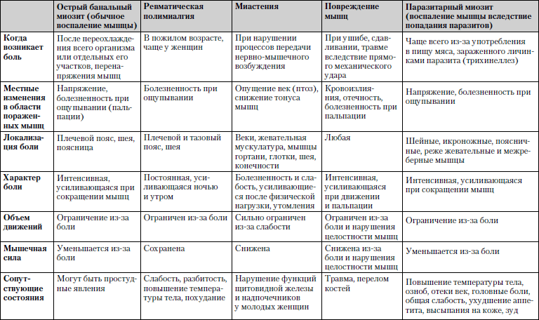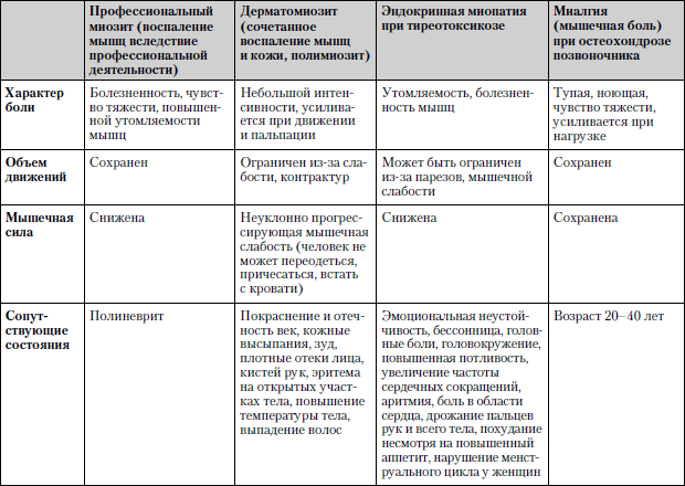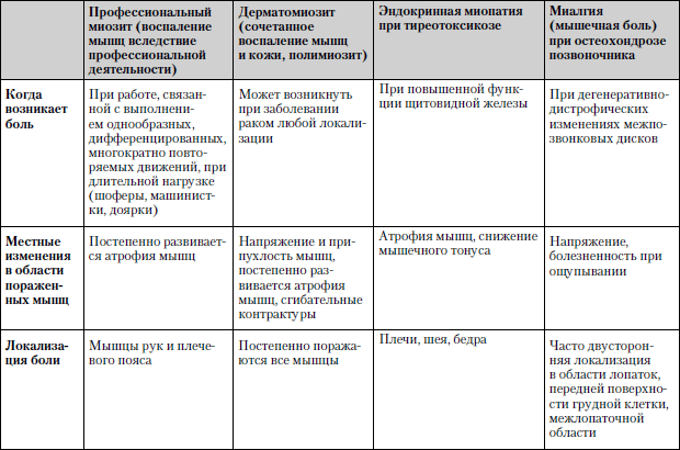 Сравнительная характеристика заболеваний, при которых боль в мышцах является одним из ведущих симптомов, представлена в табл. 1.2.