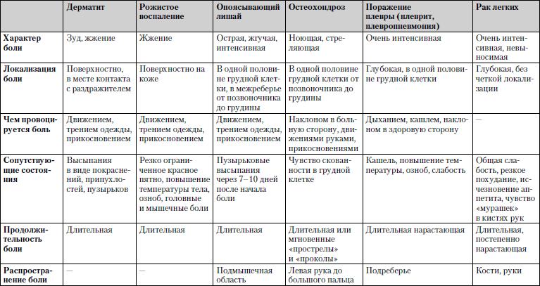 Сравнительная характеристика заболеваний, при которых одним из ведущих симптомов являются боли в области грудной клетки, представлена в табл. 1.3.