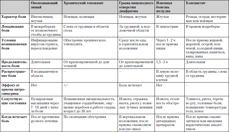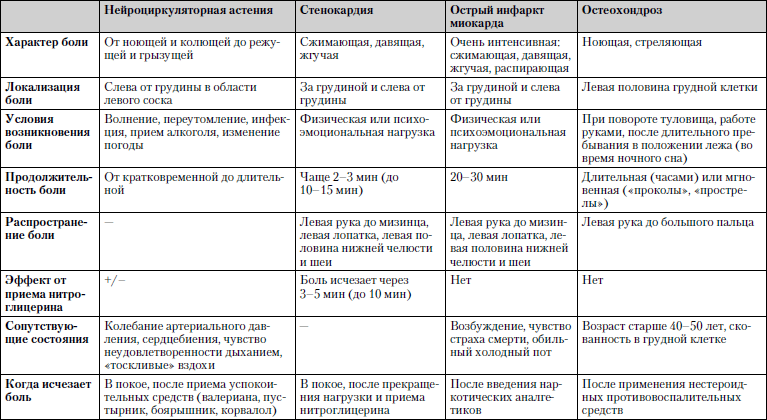 Сравнительная характеристика заболеваний, при которых одним из ведущих симптомов являются боли в области сердца, представлена в табл. 1.4.