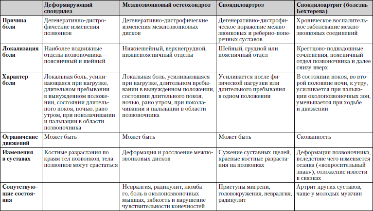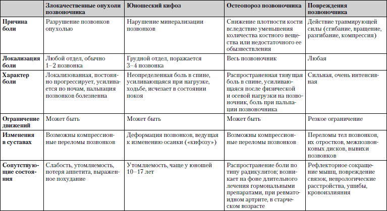 Сравнительная характеристика заболеваний, при которых боль в позвоночнике является одним из ведущих симптомов, представлена в табл. 1.5.
