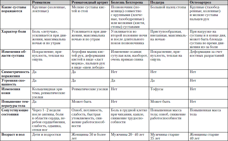 Сравнительная характеристика состояний, при которых боль в суставах является одним из ведущих симптомов, представлена в табл. 1.6.