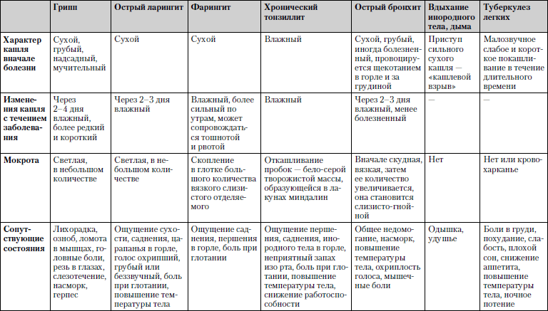 Сравнительная характеристика заболеваний, при которых одним из ведущих симптомов является кашель, представлена в табл. 1.9.