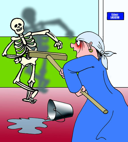 Тётя Люся кивнула и продолжила орудовать шваброй, а Мишка встал как вкопанный. Ещё бы, ведь среди привезённых пособий был самый настоящий скелет! Мимо такого Козлов пройти не мог! Он подошёл к скелету, сказал «Привет, приятель!» и пожал ему костлявую руку. Тётя Люся замерла на месте. Она не видела Мишку, зато отчётливо слышала, как скелет с кем-то познакомился и… протянул руку. В это время из кабинета музыки послышалась танцевальная мелодия, и Козлов стал дёргать скелета за все конечности, «заставляя» того танцевать. Тётя Люся в ужасе попятилась. Мишке такая реакция понравилась, и он, двигая впереди себя скелета, направился к уборщице. Скелет протянул руку к необъятной талии тёти Люси.
