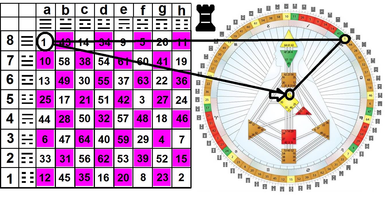 Та же звезда нашего теперешнего неба Ра Уру Ху прочитал матрицу ИЦЗИНа построчно сверху вниз слева направо первую половину от числа 1 до числа 24, а потом продолжил чтение от числа 2 до числа 44 вверх справа налево. По типу мужского и женского встречных вихрей.