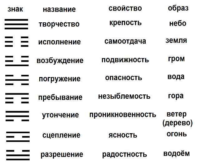 Здесь я процитирую для вас таблицу триграмм, взятую мною из книги Юлиана Константиновича Щуцкого «Китайская классическая книга перемен ИЦЗИН». На которой вы можете увидеть порядок возникновения, бытия и исчезновения вообще любого творческого импульса.