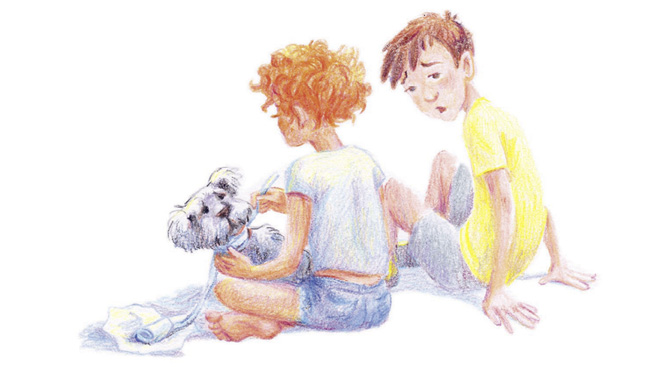 – Дай мне бинт – тот, который в открытой пачке. И мазь, ага, вот эту, синенькую. Можешь отрезать кусок бинта? Теперь выдави мазь, побольше. Ага. Давай сюда. – Летка была спокойной и деловитой. Она уверенными движениями наложила повязку и закрепила её кусками пластыря. Сашка не боялся крови и свои разбитые коленки давно мазал йодом сам: шипел, дул на рану, уговаривал себя, что ему не больно. Но лечить собак?! Как настоящий врач!