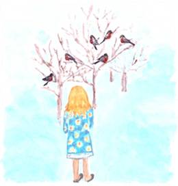 А однажды зимой Ракушка выбежала из дома в одном халате, чтобы покормить снегирей хлебом. Раньше зимой часто можно было видеть этих птиц. Они стаями собирались на деревьях. Это выглядело очень красиво: как будто красные яблоки висят на усыпанных снегом ветках.