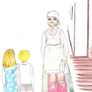 Но тут вышла баба Шура с полотенцем в руках и позвала мальчика домой. Ужинать.