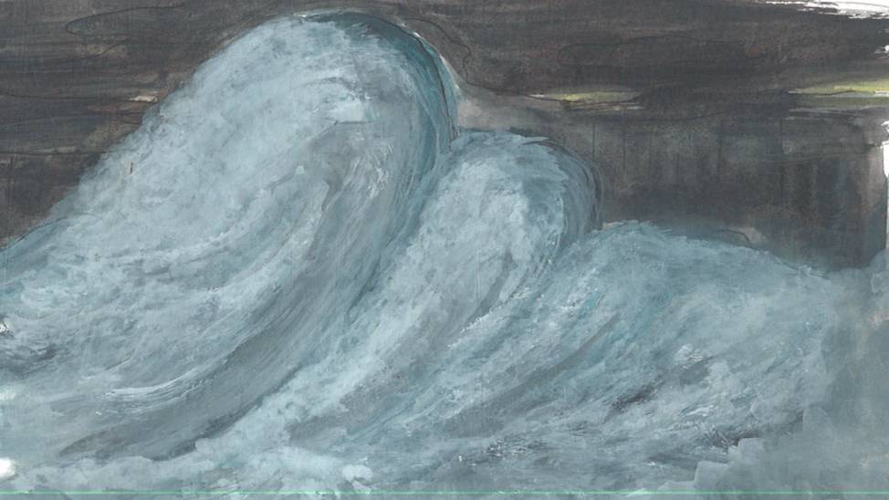 На море бушевал шторм. По небу низко плыли чёрные тучи. Капли ливневого дождя и капли воды, казалось, слились воедино. Из-за шквалистого ветра волны высоко вздымались и пенились.