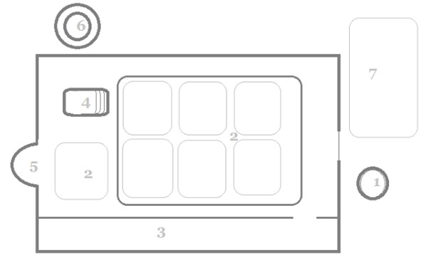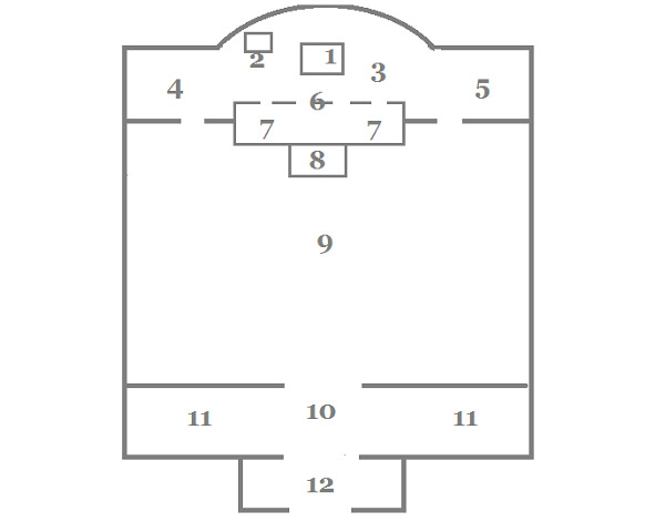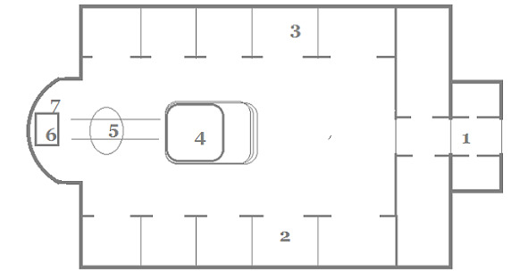 5) Sacristy (a storage room, a deacon). Place in the altar, several cabinets, or a separate room for storing the liturgical garb of priests and church utensils.