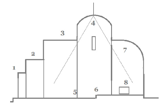 3) Altar. The space between the semicircular (eastern) wall is an apse and the iconostasis.