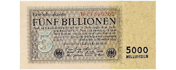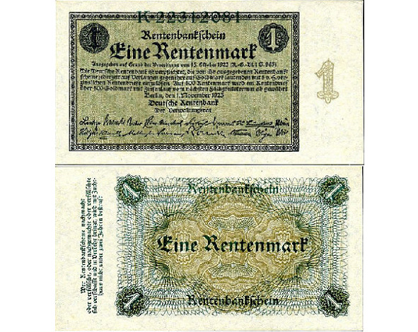 1923. aasta novembris on Saksa marki määr 4,2 triljonit USA dollarit. 1924. aastal, paralleelselt sellele, mitteametlik rahaühik – nn. kinnisvara tagatisega tagatud rendimärk. Tavaliseks kaubamärgiks on üks kuni üks triljon. Paar kuud hiljem, on õigustatud riigimark (RM), mis on võrdne selle nimiväärtusega ja nii need valuutad, et mitte kahjustada usaldust elanikkonnast, jääda ringlusse. Maksumus ühe RM – 2,5 grammi puhast hõbe, mis praeguse kiirusega umbes 150 rubla. Välimus need arved peatab hüperinflatsioon (5000% palgast – kaks korda päevas, inimesed nälgivad).