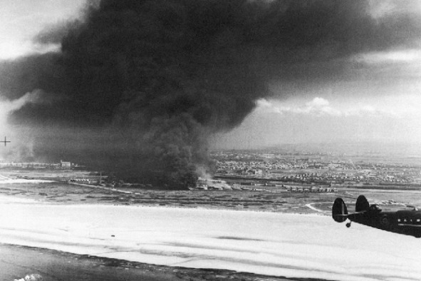 Burning oil storage Dunkirk. On the right – patrol British plane