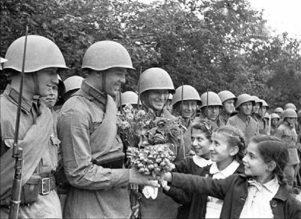 Representatives of the young generation of Bessarabia (Moldavia) present flowers to the Red Army soldiers