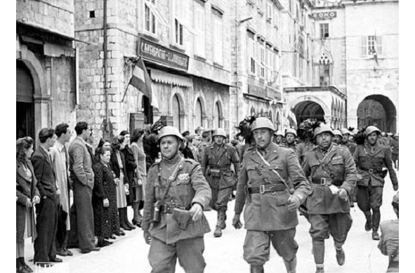 talian bersaliers (arrows of elite units) on the street of the Serbian city, April 1941.