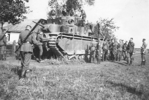 Since June 23, 1941, the battle starts for Dubno-Lutsk-Brody (320 km west of Kiev). The General of the Army G. Zhukov, who came to the scene, rejects the idea of the Chief of Staff of the South-Western Front to withdraw troops and create a solid defense line. The new plan was an immediate strike by five mechanized corps in 2,800 (later 3,100) tanks for four (subsequently – five) German tank divisions of 720 tanks and 70 assault guns. Photo – German soldiers visiting the abandoned Soviet heavy tank T-35. Weight 50 tons, 11 crew, reservation – forehead 30 mm., Board 20 mm., All towers 20 mm. The real speed for rough terrain is 10—12 km. h. Armament – one 76.2 mm, two 45 mm. guns and six to seven machine guns. Made 59 units. Until June, tanks in military operations do not participate, confining themselves to demonstrating the power of the Soviet Union in military parades