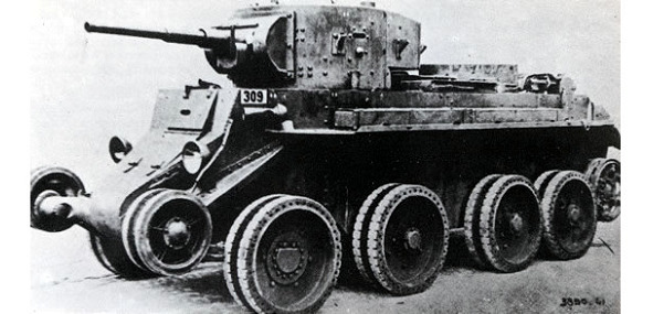 1. Wheel-caterpillar BT-5. Armament: 45 mm. gun, 115 shells, paired with a cannon 7.62 machine gun. Booking: the forehead, the side of the body 13 mm., The forehead, the side of the tower 13 mm. The speed along the highway is 52 km. h on caterpillars, 72 km. h on wheels. Crew of 3 people. Weight 11 tons. Power reserve on the highway on tracks 150 km, wheels – 200 km.; while the rubber rim wears out after 150 km. mileage. The specific power is 35 hp. (higher than that of modern tanks). Ground pressure 0, 65 kg. see with clad caterpillars, 5.65 kg. see on wheels. The number of vehicles produced from 1933 to 1934 – 1880. Most of the tanks lost in the first months of the war. Since 1942, the machines have basically been transferred to the rear, as training, a certain number of BT-5 has survived until 1945, participating, among other things, in defeating the Kwantung Army.