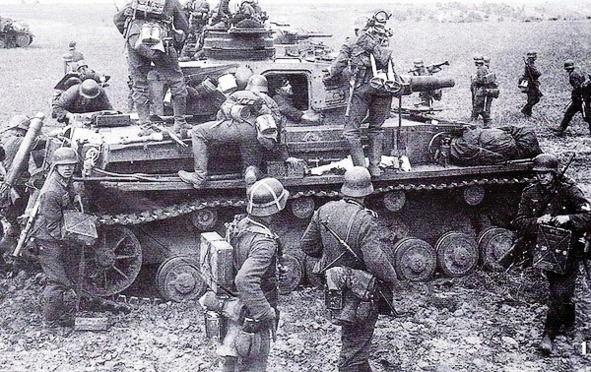 German troops near Vyazma. In the center of the photo – the T-4 tank of the first issues with short-barreled 75 mm. tool. Such a cannon is effective in infantry shooting (it is easier to adjust the range of the fragmentation of a fragmentation projectile), but, of course, is ineffective in dealing with heavily armored targets