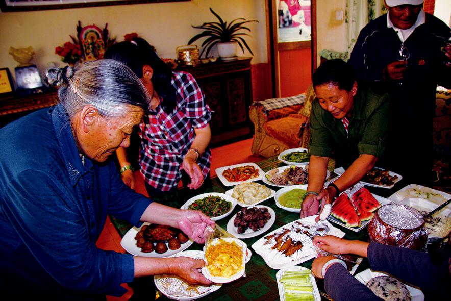 Тибетцы уделяют большое внимание этикету. Обеденный этикет отражает правила поведения тибетцев, которые живут в дружбе со своими соседями, уважают старших, заботятся о подрастающем поколении и относятся друг к другу с уважением и доверием. Когда свежеприготовленное вино уже можно пить, «первое» вино (чанг-фуд) предлагается богам, а затем самым старшим членам семьи. Каждый год во время сбора урожая старейшины всегда сначала пробуют ферментированные зерна. В повседневной жизни вся семья садится у очага и наслаждается совместной трапезой. Когда хозяйка раздает еду, она сначала предлагает ее пожилым членам семьи. Тибетцы известны своим гостеприимством. Всякий раз, когда приезжают гости, их стараются угостить лучшим ви ном, чаем и самой вкусной едой.